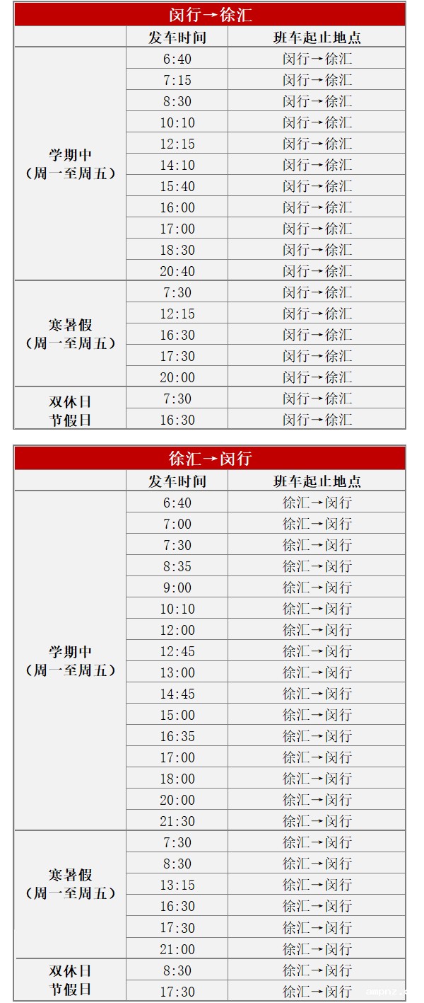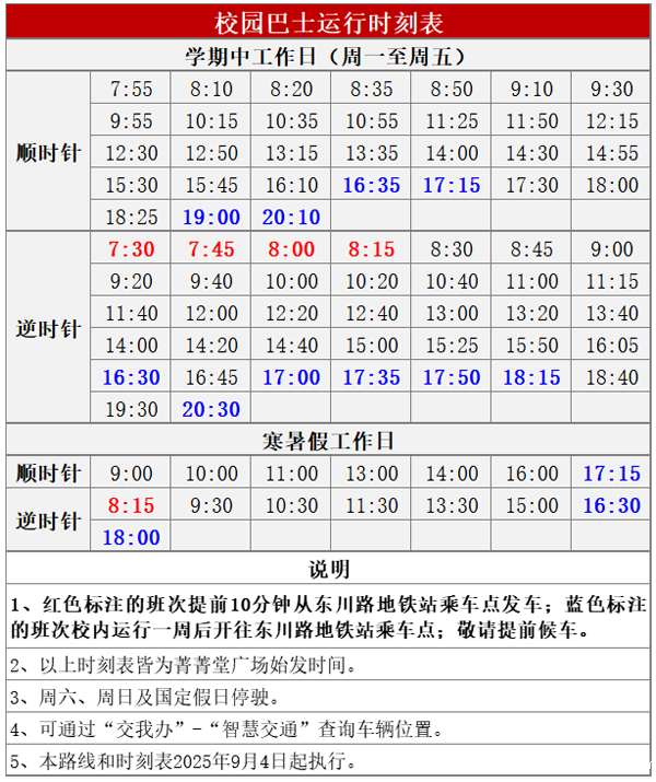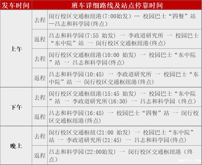 4、考试周期间,原闵行校区10:10的教工班车调整为10:30发车;原闵行校区14:10的教工班车调整为13:30发车。