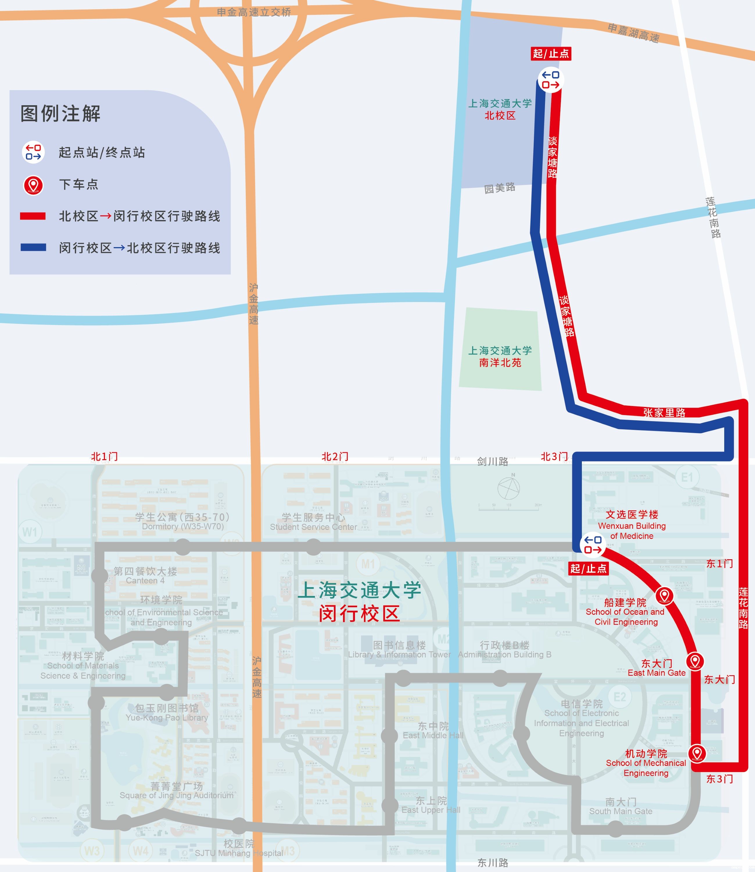 7、闵行校区候车点位于访客中心北侧(近菁菁堂),徐汇校区候车点位于南二楼北侧(近东大门)。