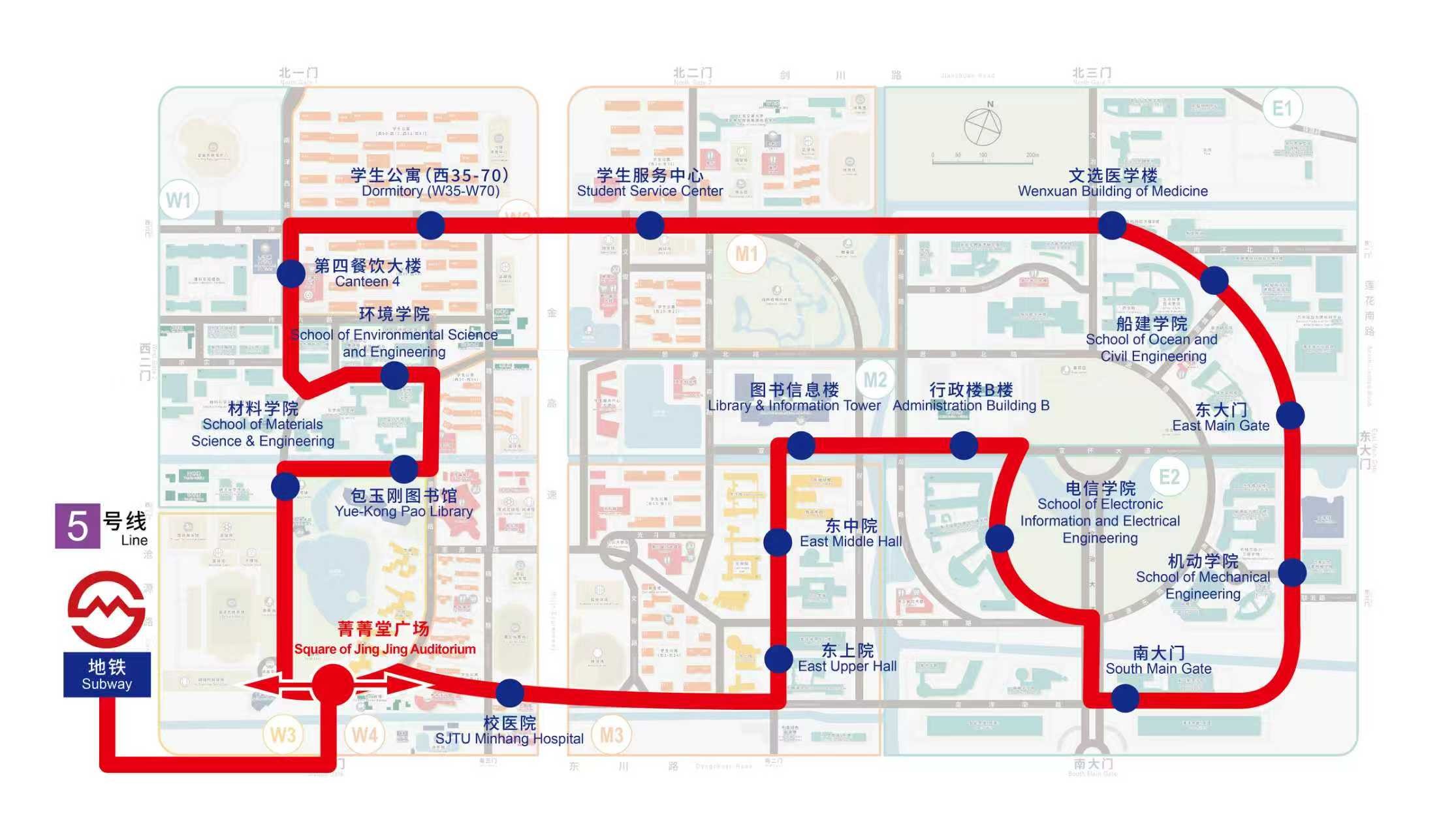 5、学期中周一至周五闵行校区17:00发车班次及寒暑假周一至周五闵行校区16:30发车班次行政B楼广场、菁菁堂候车点均可上车。